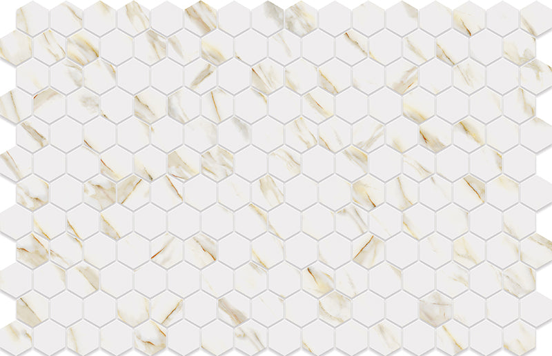Introduce luxurious sophistication with the Hexa Calacatta Look Gold Matte Glass Mosaic Tile. This exquisite collection merges the serene beauty of white Calacatta marble with gleaming gold accents, creating a harmonious balance of elegance and opulence. The hexagonal glass tiles feature a refined matte finish that diffuses light beautifully while maintaining an air of understated grandeur. Perfect for transforming backsplashes into statement features or adding a touch of prestige to pool areas, these mosaic tiles deliver both visual drama and timeless appeal. The interplay between crisp white tones and warm gold detailing makes this an ideal selection for those seeking to infuse their spaces with refined luxury and contemporary artistry.