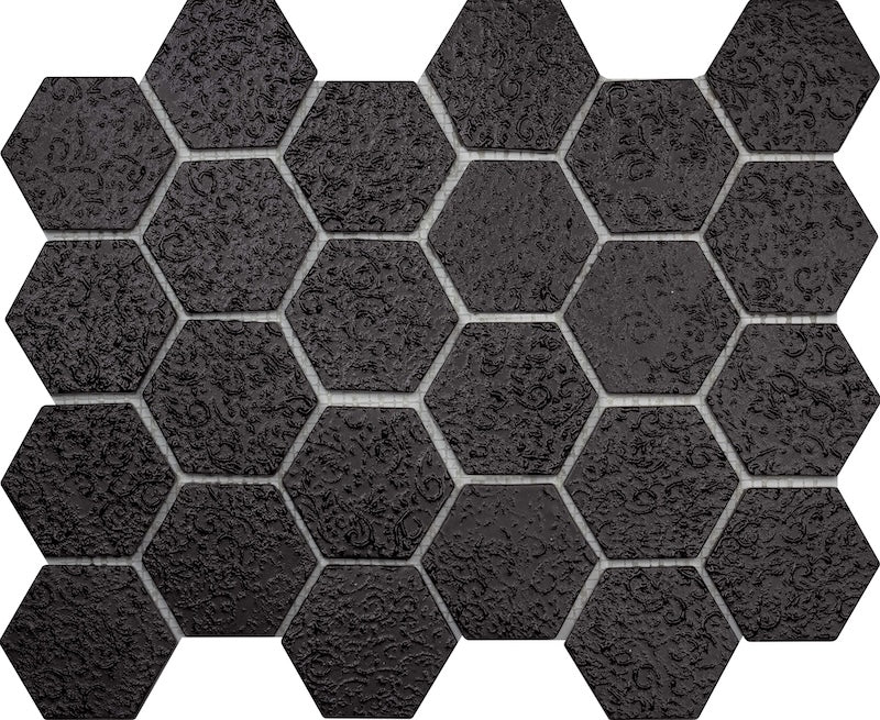 Command presence with the Hexa Mega Garden Black Matte Glass Mosaic Tile. This striking collection features oversized hexagonal glass tiles in deep black, delivering bold architectural impact with refined sophistication. The matte finish creates a light-absorbing surface that conveys contemporary elegance and understated power, perfect for spaces seeking dramatic visual definition. Ideal for establishing commanding backsplashes or framing upscale pool areas, these larger-format tiles make an unmistakable design statement while maintaining refined restraint. The geometric hexagon pattern introduces rhythmic interest without compromising cohesion, allowing the rich black tone to anchor any environment with confidence and style. Perfect for discerning designers and homeowners seeking to introduce moody sophistication and architectural presence at a grander scale, this collection transforms functional surfaces into prestigious focal points that exude timeless appeal and modern sensibility.