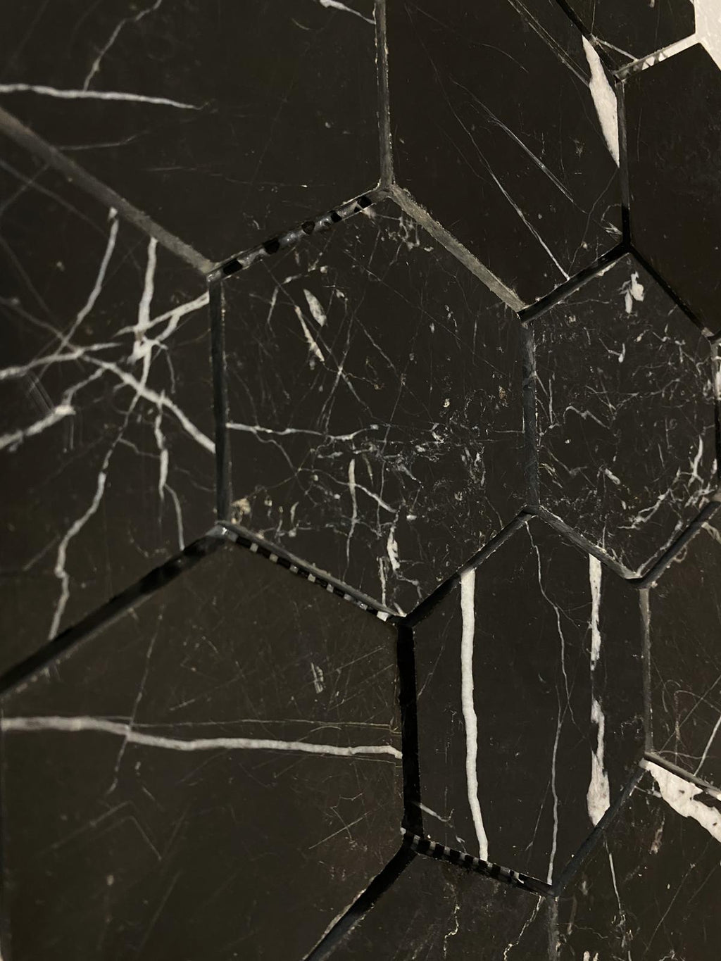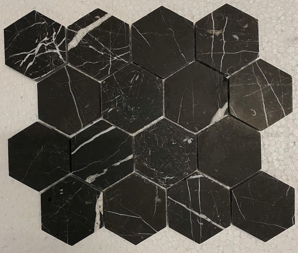 Elevate your interior spaces with the timeless elegance of Nero Marquina Marble in a striking 3x3 hexagon format. This honed mosaic tile showcases the classic contrast of deep black marble with delicate white veining, bringing refined luxury to kitchens, bathrooms, backsplashes, and spa environments. The hexagonal geometry adds contemporary visual interest while the honed finish provides a subtle, understated sophistication. Perfect for creating dramatic accent walls or sophisticated pool surrounds, each tile is a testament to natural stone craftsmanship. Transform your design vision into reality with this versatile, upscale mosaic that commands attention through understated beauty.