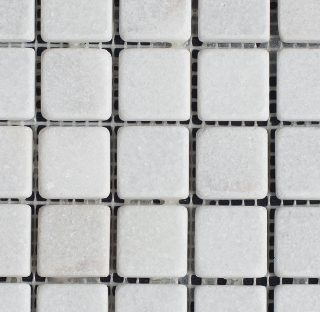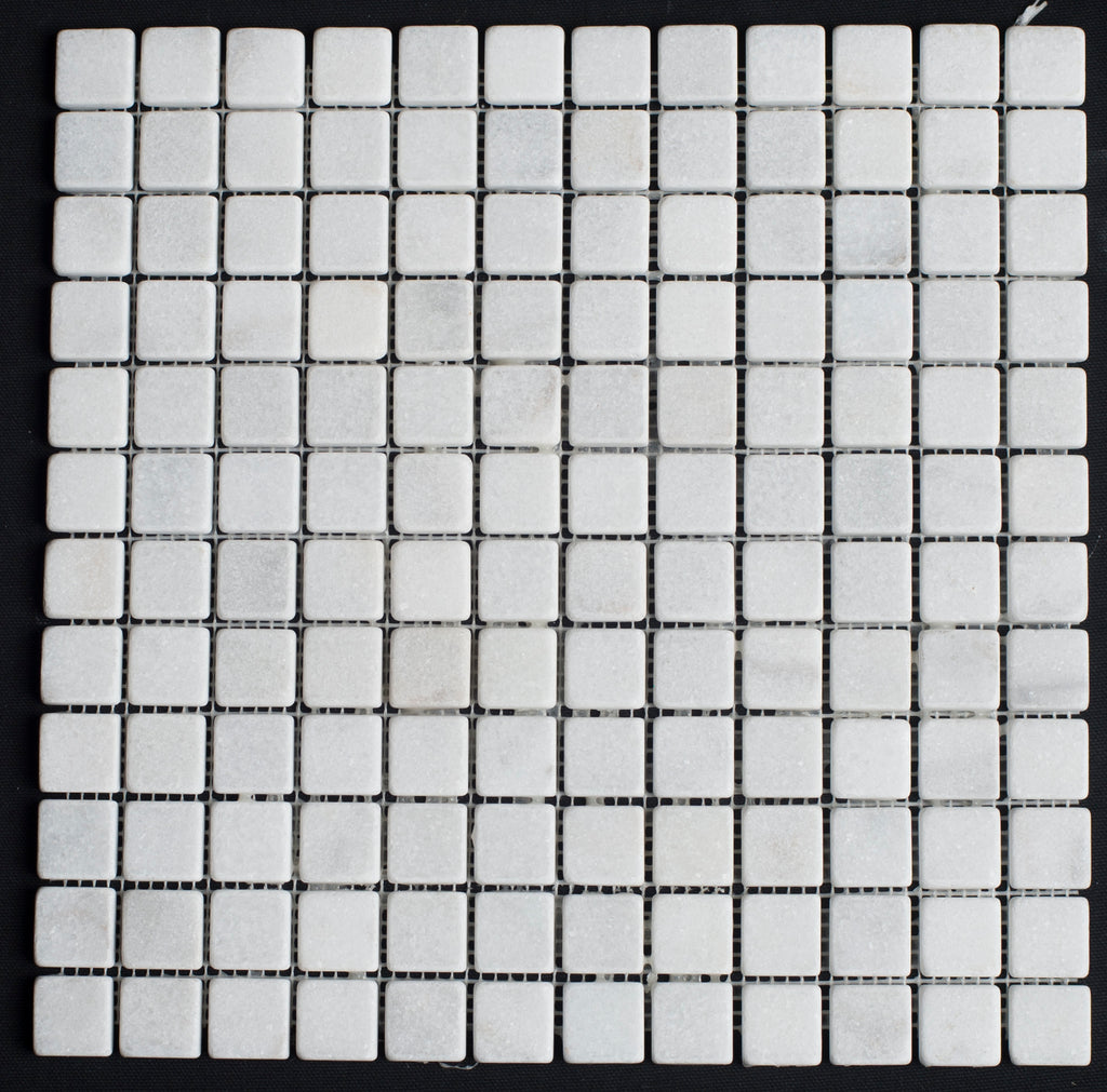 White Carrara marble mosaic tiles bring timeless elegance to any space. These 1x1 tumbled pieces feature the classic veining and soft white tones that define luxury design. Perfect for kitchen backsplashes, bathroom accents, spa surrounds, and pool borders, their versatile appeal works equally well in interior and exterior applications. The tumbled finish adds subtle texture and a refined, aged aesthetic that complements both contemporary and traditional décor. Create stunning focal points or seamless transitions with these sophisticated marble mosaics.