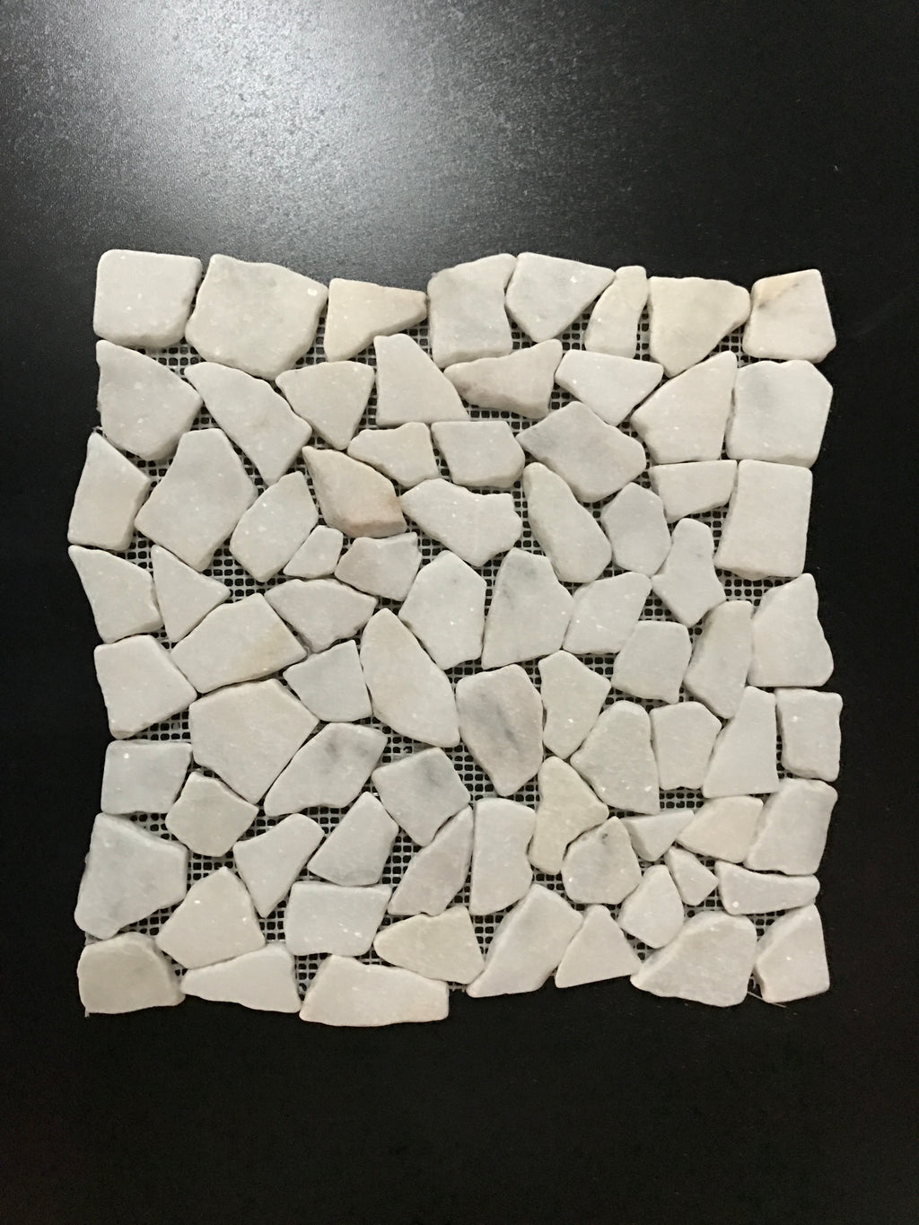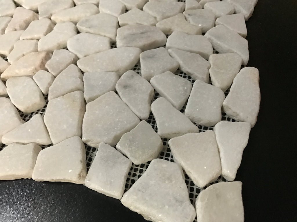 White Carrara marble pebbles bring timeless elegance to any space. Each stone is tumbled to reveal soft, natural contours and a refined matte finish. Perfect for kitchen backsplashes and bathroom walls, this mosaic tile combines classic Italian marble with organic texture. The neutral white tones complement contemporary and traditional designs alike, creating visual interest while maintaining understated sophistication. Ideal for accent walls or feature installations where natural stone beauty takes center stage.